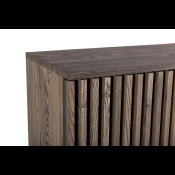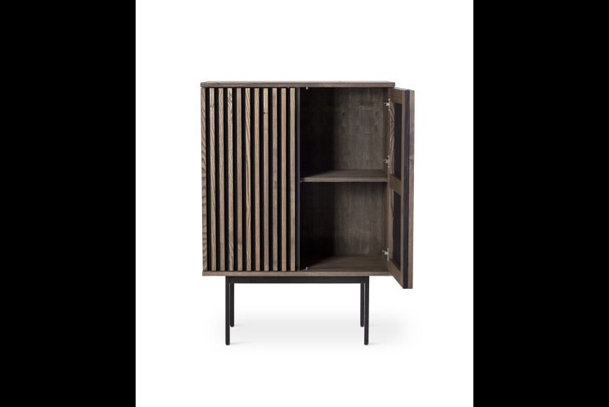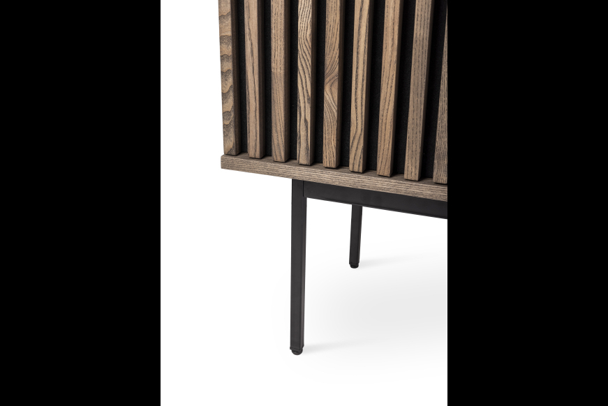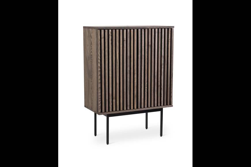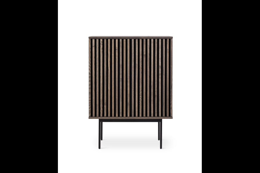 AKUSTIK HIGHBOARD fra Kristensen & Kristensen er designet med ønske om at forbedre akustikken i boligen samt opretholde et pænt udtryk. Kombinationen af trælameller og filt, er ikke blot tænkt ind i designet for at fornøje øjet, men i lige så høj grad for at absorbere rumklang. Highboardet er vist her i massiv mørk grå olieret ask med sort metal sokkel.