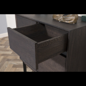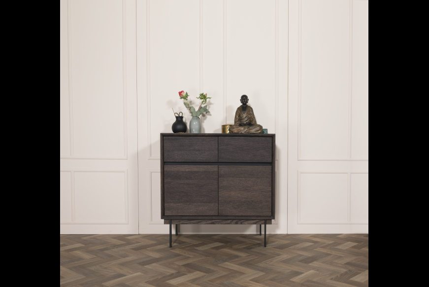 ELEGANT fra Kristensen & Kristensen er en serie der forener det nordiske minimalistiske og æstetiske udtryk med tidløse materialer i et stilrent design. Skænken er vist her i massiv mørk grå olieret eg med sort metal stel. Der er mulighed for at hænge den på væggen også.