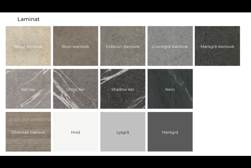 Til sidste skal du vælge hvilken laminatfarve du vil have bordpladen med, du kan se eksempler på farverne i billederne.