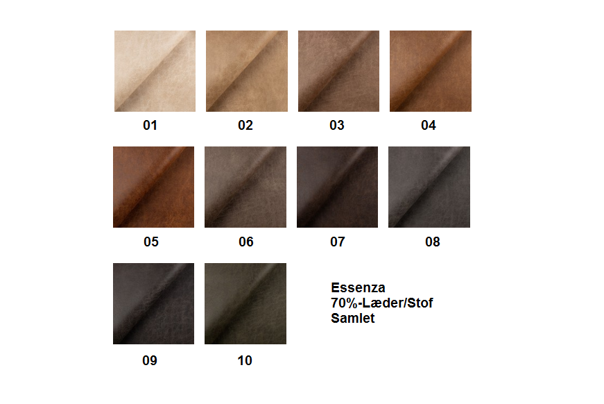 Essenza er et kraftig læder/tekstil økoprodukt, som består af 70% genanvendt læder. Effekten af læder kombineret med tekstilernes åndbarhed gør at betrækket er temperaturneutralt, hvilket betyder at det ikke føles lige så koldt om vinteren og varmt om sommeren, som man ofte oplever læder.
