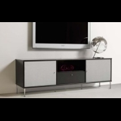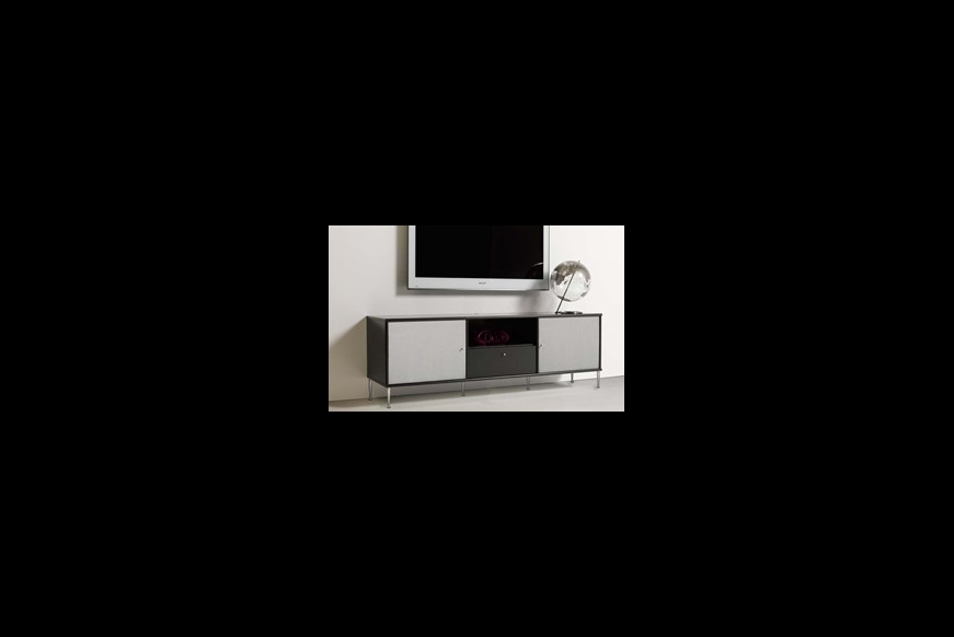 Let og elegant sort lakeret tv møbel med stoflåger i sølvfarvet, som lyd og signal let går igennem