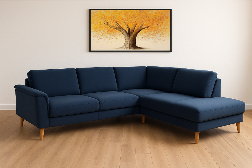 Openend / hjørnesofa, monteret med kraftig stof. Fås også i læder.